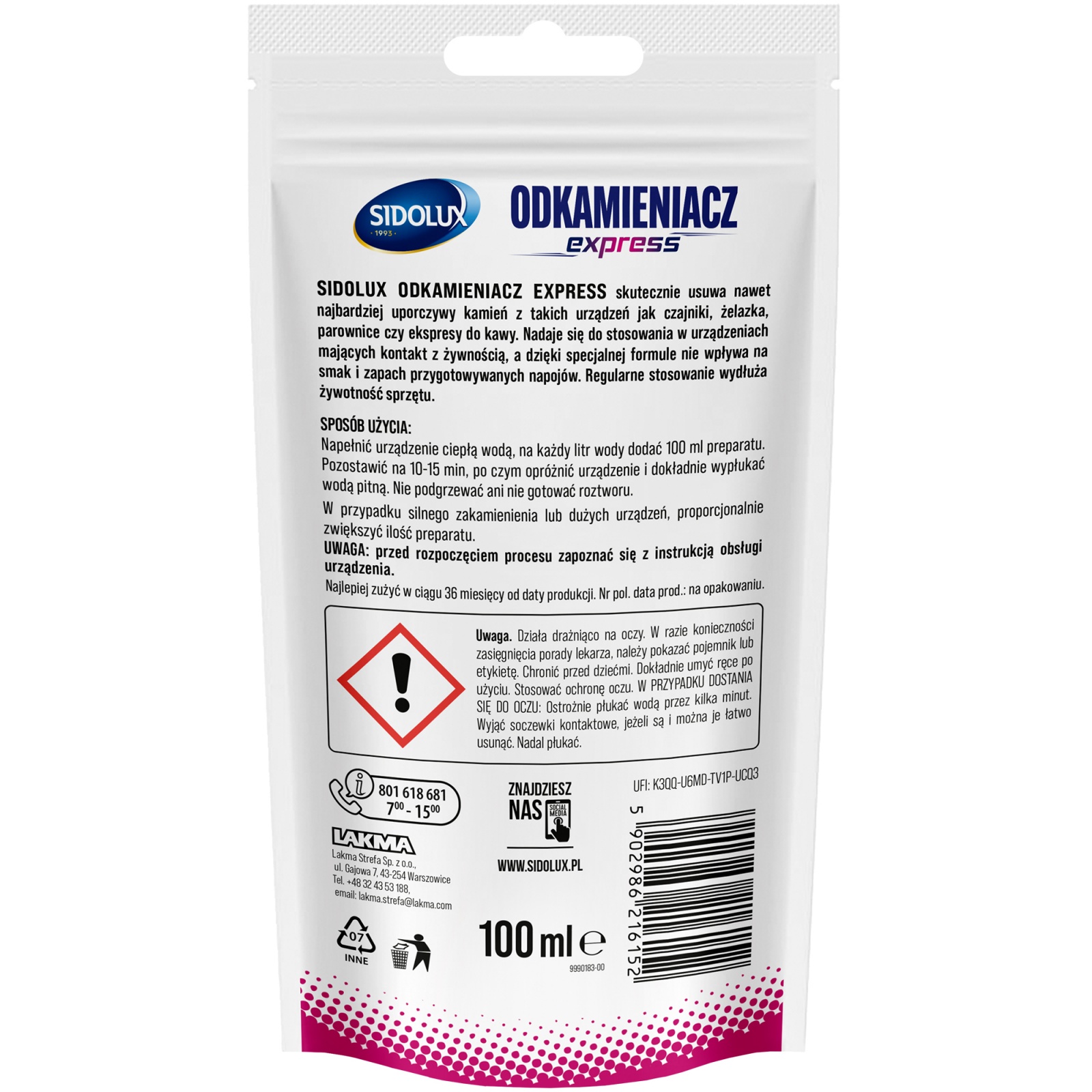 ODKAMIENIACZ SIDOLUX skutecznie usuwa nawet najbardziej uporczywy kamień i osady wapienne z takich urządzeń jak czajniki, żelazka, czy ekspresy do kawy. Nadaje się do stosowania w urządzeniach mających późniejszy kontakt z żywnością. Regularne stosowanie wydłuża żywotność sprzętu.